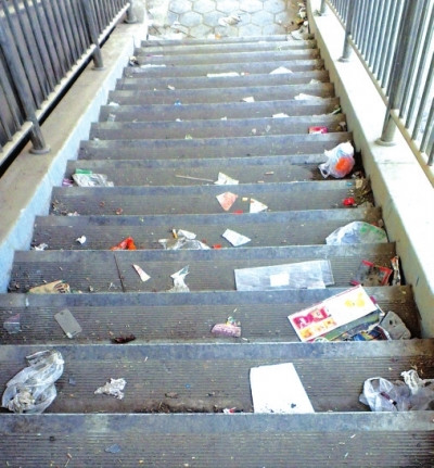 昨日,记者途经东岗东路西北油漆厂附近的过街天桥时看到,桥面和台阶上垃圾遍地,随风飞舞。 记者滕效宏摄