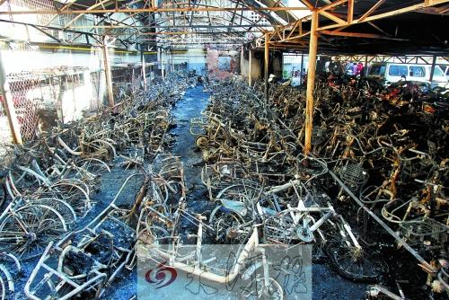 小区车棚夜半着火 150余辆电动车烧成废铁(图)