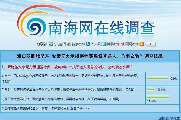 海口双胞胎早产父亲欲送人 获四成网友支持