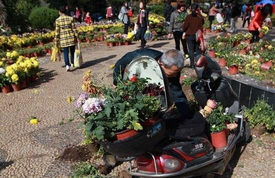 一位女士一边跟记者说,“要赶快,等下别人挑完了”,一边仔细挑选着菊花的颜色和品种,觉得合适的就连花盆一起装进塑料袋里。