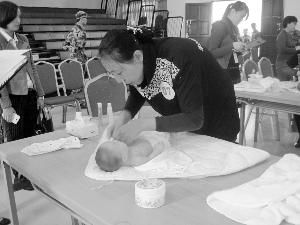 参加技能大赛的家政服务人员为婴儿做护理。