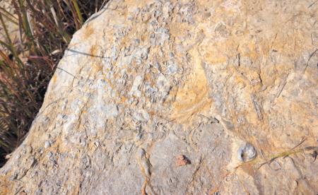 井冲村好山岭的这块大石头上密密麻麻地“长”着化石。化石表面,海螺的纹理清晰可辨。 邱向明 摄