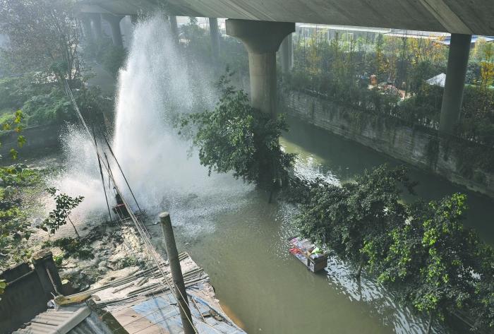 昨日上午10时许,成华区红花堰红旗一队北新干道桥下,一根直径1米的输水管施工人员钻破个直径20厘米左右的窟窿,大水喷涌而出,夹带大块砖石,打在高约6米的桥梁上。城东管网所工作人员关掉漏水点两边闸门,12点23分,水柱才忽然变矮,最后消失。