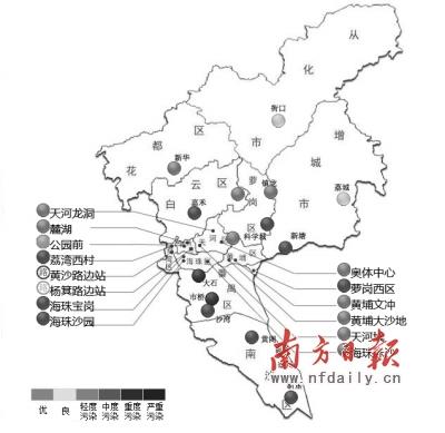 昨日21时左右市环保局网站监测到的数据显示,广州仅两个站点为良好。网络截图