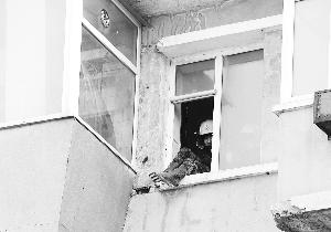 3日11时40分,在虎林街一处拆迁楼房的6楼窗台上坐着一位40多岁的女子。楼下众多围观市民一直在大声劝解。就在这位要跳楼的女子坐在窗台上失声痛哭时,一名消防员将其一把抱住,救回屋内。
