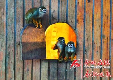 ○小动物们同样怕冷,松鼠猴正在通过小木屋里的红外线设备取暖。