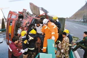 据了解,宝鸡消防铁塔路中队接警后迅速赶到现场,发现一辆车牌号为甘N29833满载肉鸡的大货车侧翻在防护墙旁,货车车体已严重变形。驾驶员被死死卡在变形的驾驶室内。救援官兵随即用破拆器材进行破拆,解救驾驶员。侧翻的大货车由于受撞击油箱破损,造成油箱内柴油大量外泄,两名消防队员用水枪对路面上的油污进行稀释,另外两名消防队员保持警戒,经过半个多小时的紧张救援,卡在驾驶室的驾驶员被安全救出,送往就近的医院。随后,消防官兵们又对大货车进行了反复侦查,确定没有柴油泄漏后,将事故现场移交给路政和交警部门。