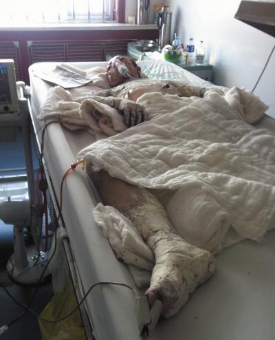 “我刚看到他时,他的皮肤都被烫得发白发皱,再过一会儿就肿起了水泡,他的手肿成一个球,都分不开漏了。”昨天下午,记者在医院重症监护室见到李国瑞时,全身赤裸的他,从胸背、双臂、两手,再到臀部、大腿,都被涂抹上了白色的烫伤药膏,像座雕像一样动也不动。护工说:“他现在不能动,一动就疼。”记者尝试问李国瑞情况如何时,他的胸腔像风箱一样忽闪着,说出的话也含糊不清。医护人员介绍,目前在ICU的李国瑞全身50%皮肤被烫伤,目前正在抗感染阶段,日后他还要接受植皮治疗。