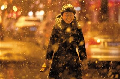 2012年11月4日凌晨,东直门簋街,女孩在大雪中与同伴说笑。当日,北京城区普降首场雪。新京报记者 侯少卿 摄