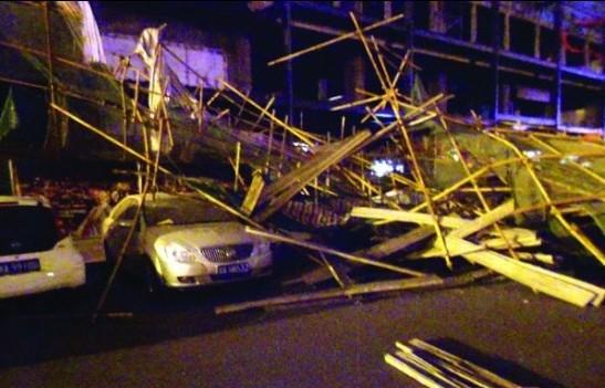 长沙狂风吹倒数十米脚手架 砸坏路边五辆车(图)