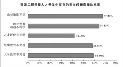 目前,理论界对职业化和国际化问题的研究有多种视角,成为理论和实践探索的一个“资源富集区”,尚待深入挖掘。但从政策创新的角度看,通过导入“职业化”和“国际化”的概念,认识和把握工程科技人才的职业发展规律、特点,深入分析当前队伍建设中存在的突出问题以及建立具有国际可比性的人才培养、评价和使用制度模式,是一个有益视角。本课题针对当前我国工程科技人才开发中的突出问题——“大学教育不完善”“职业发展通道不科学”“成长激励不足”“继续教育不完善”“人才评价有问题”进行了问卷调查。对照现实状况,受访的工程师群体从以上五个问题中选择突出的三项,相关题项的选择比率如图所示。