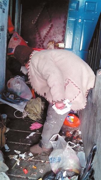 魏玉珍老人将垃圾堆在楼道里。本报记者 陈玲 摄