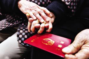 鉴于二老的考虑,他们不愿刊登自己的照片。我们拍下了这张两位老人手拿结婚证,十指相扣的照片。祝两位老人:新婚快乐! 孙琳 摄