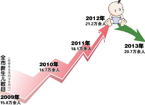 来自市卫生和人口计生委的统计数据表明,2013年深圳新生儿数量20.7万余人,比去年减少约0.6万人。这是深圳近5年来新生儿出生人数首次结束每年近10%的增长出现回落,下降为20.7万余人。而去年却也是新生儿人数增长最迅猛的一年。按全人口统计,去年全市新生儿活产总数为212667人,比上年增加16.87%。