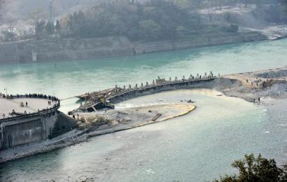 都江堰内江维修截流正式开始,该工程用已有两千多年历史的古老“杩槎”截流术(古法截流)截流江水。在断流过程中,工人运泥石筑拦水坝的工具都是竹筐。拦水坝的主干由15座杩槎构成,辅以黄泥和填充了卵石的竹笼。其余的杩槎置于拦水坝前,缓解江流。杩槎由6根长9米、直径40多厘米的圆木绑扎而成,没用一颗铁钉,绑扎工具仅是工匠编织的竹绳。截流时,杩槎与木梁、竹席相连成排置于水中,上面用装满卵石的竹筐压重固定。这种古老的截流方式可就地取材,使用灵活,功效颇高,而费用仅为现代化抛石围堰截流的三分之一,并且相当环保。(记者席秦岭)