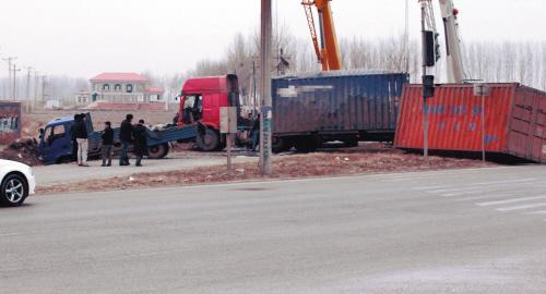 沈阳晚报、沈阳网记者赶到现场时看到,事发地点为一个路口,一辆红色的拖车横在路边,而拖板上的两个集装箱倒在地上,外壳已经变形,从破损处散落出了大米。而在它不远的地方一辆蓝色的货车因为撞击,直接栽到了沟里,车窗等部位破损。