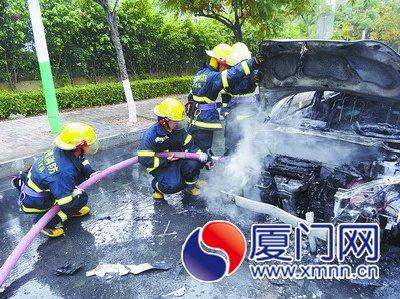 何厝边防派出所的翁警官介绍说,事发地点位于环岛干道海峡国际社区路段,警方赶到现场时,一辆小轿车起火,不时发出“砰砰”的爆炸声,车内烧得仅剩铁架。