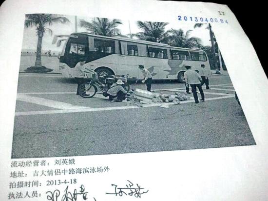吴主任向羊城晚报出示了2月和4月的执法档案。吴主任告诉羊城晚报记者,当时执法人员对其出示处罚文件后,刘某试图撕毁这些文件。而对于刘某被收缴椰子后走进大海的做法,执法队员不觉得新奇。在珠海香洲城管出具的图片显示中,今年4月份刘某被处罚后就将小三轮车搬到情侣路中央,自己也躺在马路上。