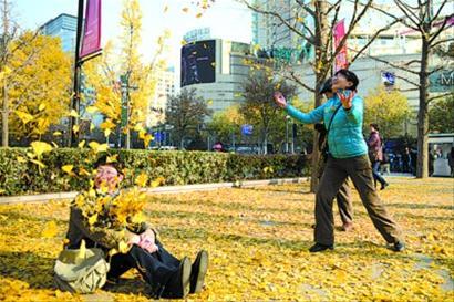 持续数天的雾霾昨天退去,蓝天重现上海。两位市民在铺满银杏叶的地上玩耍。