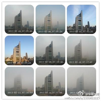 市民邹毅拍摄的今年1月27日至2月22日北京的天气照片。他从1月27日起,每天早上以同一地点作为背景,拍照记录北京的天气情况,呼吁公众保护环境。邹毅供图