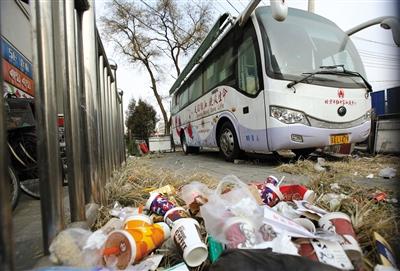 昨日,积水潭新华百货商场门口,停着一辆流动采血车,车身积满灰尘,四周垃圾遍地。新京报记者 黄月 摄
