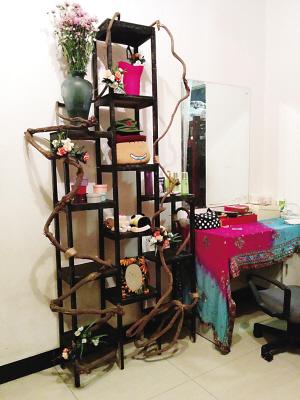 昨日,重庆晚报记者在小杨家看见,这是一间老式结构的房子,没有电梯,面积约30平方米。进门就是厨房,客厅门悬挂着竹制门帘,墙角土坛里插着3根桃树枝,上面绑着十几枝金色假花。梳妆台旁搁着一个黑色置物架,上面放着花瓶、相框等。内阳台上放着一张双层床,小杨用蕾丝和冰绸做了一个帘子,隔出一间卧室,床上铺着大红色被单,很温馨。