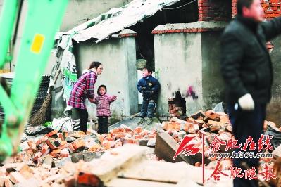 居民带着孩子在等待搬迁的猪舍前玩耍