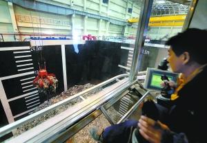 与此同时,在航天飞机驾驶舱一般的垃圾池抓斗操作室里,坐在“机长”座椅上的操作员正紧盯着监控屏幕:为了保证安全,当进料口大闸门关闭、门上安全指示灯和监控屏幕上的相应指示灯同时由绿变红后,座椅扶手上的两只抓斗操纵杆才能恢复功能,只见他娴熟地控制着垃圾里的那只抓斗,左手握住操纵杆控制着连接抓斗的天车前后运行,右手摆弄着操纵杆,指挥抓斗“下潜”,把爪子张开抓住池底堆积如山的垃圾——橘红色抓斗一把就可以抓住10吨左右的垃圾。