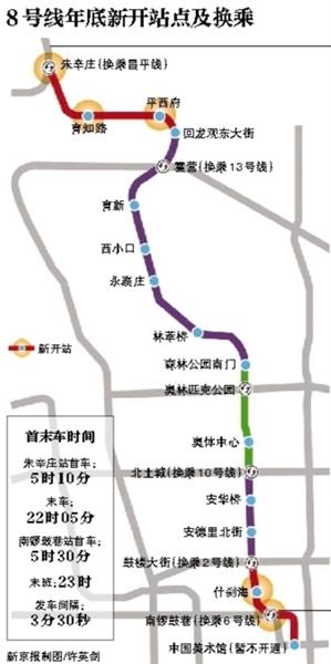 据北京市轨道交通建设管理有限公司一中心副总经理张晓岩介绍,8号线南段原计划通至中国美术馆站,但该站施工难度较大,目前站台尚未完工,因此暂不能运营,将延后与8号线三期一起开通。