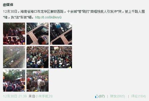 昨天,一名网名为“媒体”的网友在微博上刊发了一条信息,“12月30日,海南省海口市龙华区解放西路,十余城管殴打卖唱残疾人引发冲突,被上千路人围堵,执法车被砸。”这位网友还晒出多张反应事件现场的图片。从图片中可以看到,城管执法车的车窗被砸碎,多人站在车顶上,情绪激动。在车周围,有大量群众聚集。
