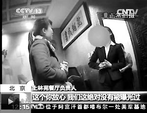 北海公园内一家名为“上林苑”的餐厅,包房装修精美,价格最低也要3688元一桌,另收10%服务费,人均最低消费400多元。如果分餐的话,则要788元一位,也要另加10%服务费。记者担忧,“消费会不会有风险?”餐馆负责人表示,“安全你绝对放心,我们这从没有人来调查过。”当记者表示,想喝高档白酒,又不想让别人看到。服务员马上说:“给你围上,把包装封起来”,并再次强调“这个您放心,我们这里绝对没有被曝光过。我们这儿特别私密。”(图)