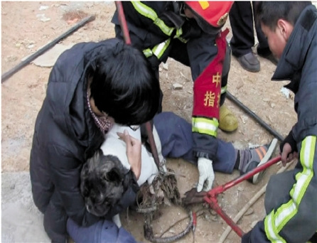 女孩一家刚走,消防员就赶到了,帮小杨把狗狗救了出来。后来,小杨带着豆皮去宠物医院检查,好在也只是皮外伤,没有伤及骨头。