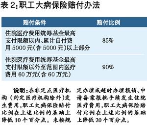 而根据《职工大病保险》,职工大病保险具体支付办法是以参保人住院累计自付费用和基本医疗保险基金年度累计最高支付限额以上的范围内医疗费用进行确定(具体办法见表2)。(文/记者黄子宁 图/记者陈卓达)