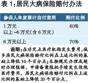 关于居民大病保险的起赔标准为1万元,其起赔标准原则上与上一年度当地农村居民年人均纯收入相当,并不高于当地城镇居民年人均可支配收入来确定。此外,对于城乡医保参保超过1万元以上的报销比例也会根据个人年度累计自付部分的费用范围而有不同(详见表1)。