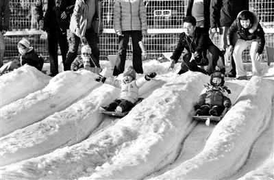 龙潭公园“冰雪嘉年华”,孩子们正在人造雪上玩耍 摄影/本报记者 郁骁