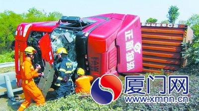 拖挂车像脱缰的野马,冲开20米护栏,敞着“肚皮”躺在绿化带上。昨日中午,事发集美大道中科院BRT旁,集美孙坂消防中队救出被困的驾驶员。