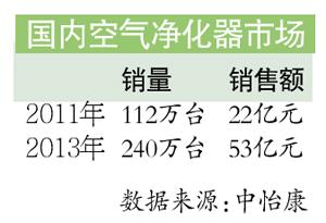 “目前还是洋品牌卖得多一些,某品牌的某款产品前段时间甚至出现断货现象”。昨日,国内多地再现雾霾天气,这直接激活了原本小众而边缘化的空气净化器市场。记者调查发现,2012年底灰霾天气出现后,消费者对空气质量关注陡增,长期亏损的空气净化器市场规模瞬间暴增,市场规模从2011年的22亿元的市场销售突增到2013年的53亿元。然而,由于目前国家尚无相关标准,加上进入门槛低,众多企业扎堆进入,整个市场处于竞争无序状态。
