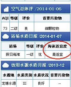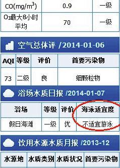 7日上午,的确如李先生所说,当记者打开海口市环保局官方网站后发现,在主页右边栏有一处为“浴场水质日报”,后面的时间为“2014-01-07”。记者看到,官网上写着假日海滩浴场水质等级为一级,评价为优,海泳适宜度为最适宜。然而,海口市海洋环境监测中心相关负责人此前接受媒体采访时却表示,日前假日海滩海域球形棕囊藻繁殖太多,会影响水质,对海洋养殖业造成影响,或对人体产生危害,因此建议市民不宜下海游泳。