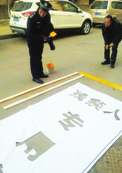 1月8日下午5时许,雁滩安居小区物业公司领导带着提前准备的残疾人停车位标识来到小区开始划车位,工作人员在一处出口的位置选好了位置,用黄色醒目油漆开始图画,但由于提前准备的字号模块出了问题,工作人员只好用刷子直接涂写,经过一番努力,一个醒目的残疾人专用停车位画好了。