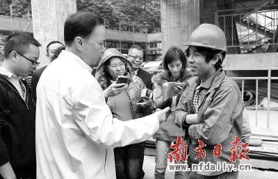 越秀区广隆大厦施工现场工人介绍薪酬发放情况。南方日报记者 李细华 摄