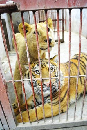 昨日,记者在该动物园里看到,这只老虎与狮子依偎在一起,狮子时不时地用爪子给老虎“挠痒痒”,老虎则把头贴近狮子。当记者靠近铁栅栏时,老虎“嗷”的一声吼叫,用两只前爪趴在围栏上,狮子则在老虎身边转来转去。