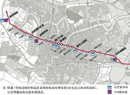 轨道交通1号线接驳设施覆盖1号线一期全部20个站点,每个站点周边100米范围内均设置公交停靠站、非机动车停车场和出租车扬招点。客流集中的大型站点还配备公交首末站,满足常规公交与轨道交通的换乘需求;城市外围车站设有P+R(P指停车,R指换乘)停车场,按照设计方案,20个接驳点中有三个设计为P+R停车场,分别为西部的高桥西站、望春桥站和东部的东环南路站,对进入中心城区的小汽车进行截流,缓解中心城区道路拥堵。