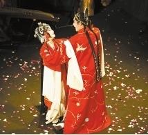 舞台其实更像个宽敞的客厅,演员、乐队和观众共处一个开放的空间,四壁是被岁月磨去棱角的青灰砖墙。舞台没有“台”,也无帷幔,演员与观众近在咫尺。观众席只有6排坐椅共60个席位。演出开始,灯光暗灭,幽幽笛声在身后响起。回头才发现,与正面表演区遥相呼应,在观众席之后,设置了一爿亭台。一位明朝装束的老者悠然吹着笛子,步出亭台,从观众席穿行而过。随后,杜丽娘步态轻盈,颦笑间,红唇微启,唱腔婉转。“惊梦”一折,片片花瓣从高悬的屋脊上纷然而落;而“离魂”一折,杜丽娘因相思气绝身亡,空中洒下丝丝细雨,在鱼缸中泛起阵阵涟漪,搅得观众思绪万千。听那温婉柔情的唱,恍若隔世,心被牵回到了600年前。