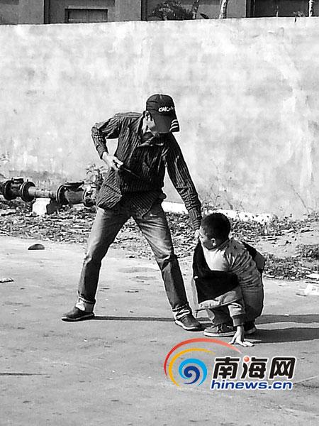 前方路边站着一名中年男子,他正用左手紧紧地抓着一个小男孩的衣服,右手则持尖刀对着小男孩。小男孩显然吓坏了,瘫坐在地上一动不敢动,一边大哭一边说:“不是我,不要打我……”但男子情绪非常激动,不断地冲着小男孩大吼大骂,恶言相向。
