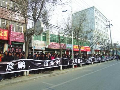 中午12时,岷县公安局的干警和数万名市民列队护送邵彦鹏的灵车缓缓行走在岷县的大街上。当邵彦鹏的灵车经过城区时,不断有群众自发加入到送葬队伍中,为他送行!