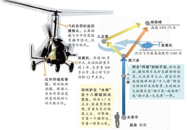 旋翼机携带的红外热磁成像仪被失踪者尚先生家属及救援人员寄予厚望。来自北京的尚先生朋友王先生说,该仪器是他们从北京一家公司借用的,现在这几乎是唯一能找到尚先生的渠道了,但大家未能从此次摄录影像上发现有价值的线索。