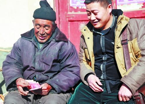 收到陈武现(右)还来的钱,胡书堂说,这下可以治腿病了。