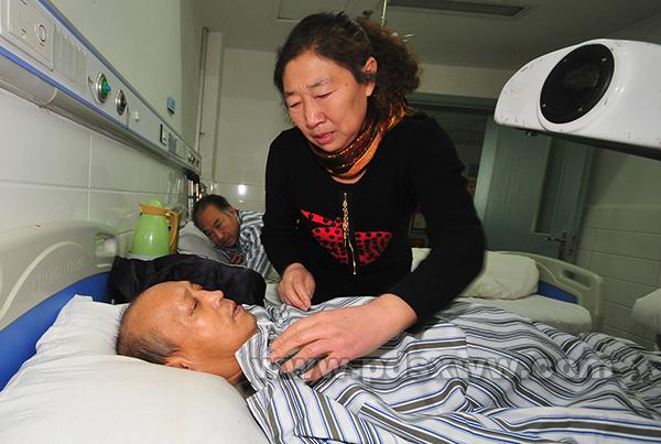 姐姐王玲利在病房里照顾患病在床的弟弟王全有。