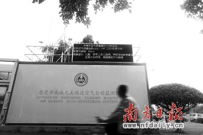 东莞南城元美路边的空气自动监测站电子屏实时显示PM2.5数据。 胡国球 摄