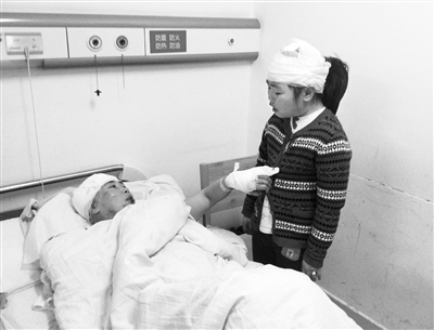 昨日18时,躺在中美医院四楼骨科病房内。医生正重新包扎蒋绍静的食指,她头上缠着纱布。